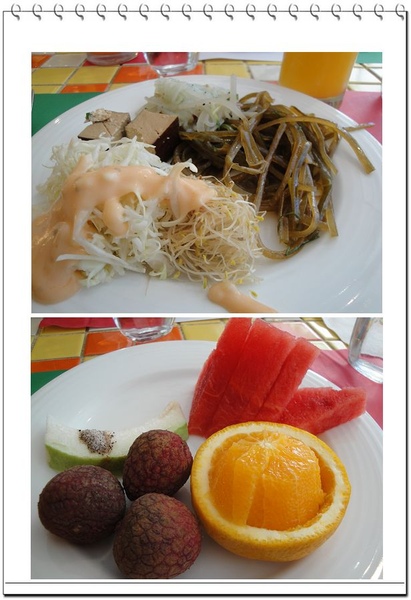 店裡的自助沙拉吧區有多樣沙拉、水果可自行取用,也有海帶絲、豆干、炸蛋等冷盤菜可拿,